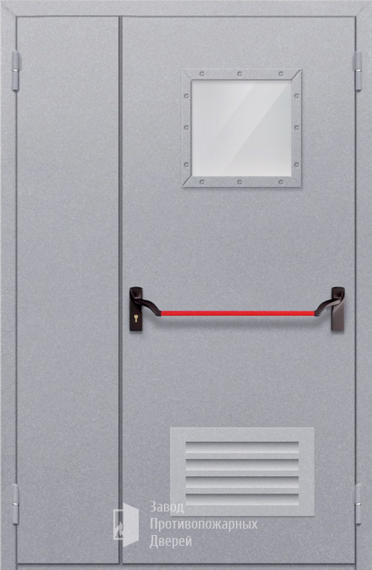 Маркировка Противопожарная Полуторная дверь с квадратным стеклом ДПМ-02-EIW60 с решеткой и антипаникой